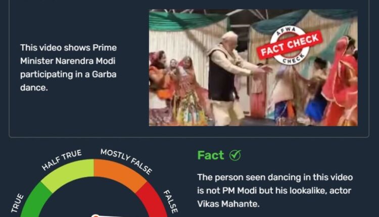 ନୂଆଦିଲ୍ଲୀ: ପ୍ରଧାନମନ୍ତ୍ରୀ ନରେନ୍ଦ୍ର ମୋଦୀ ନବରାତ୍ରୀ ସମୟରେ କିଛି ମହିଳାଙ୍କ ସହିତ ଗରବା କରୁଥିବାର ଏକ ଭିଡିଓ ଓ ଚିତ୍ର ନିକଟରେ ସାମାଜିକ ଗଣମାଧ୍ଯମରେ ଖୁବ ଭାଇରାଲ ହୋଇଥିଲା । ତେବେ ଏହି ଭାଇରାଲ ଭିଡିଓରେ ମୋଦି ନାହାନ୍ତି ଯେଉଁ ବ୍ୟକ୍ତି ଜଣଙ୍କ ଏଠାରେ ଗରବା କରୁଛନ୍ତି ସେ ମୋଦିଙ୍କର ଡୁପ୍ଲିକେଟ୍ ବା ନକଲ ଭଳି ଦିଶୁଥିବା ଜଣେ ବ୍ୟକ୍ତି ଅଟନ୍ତି ।